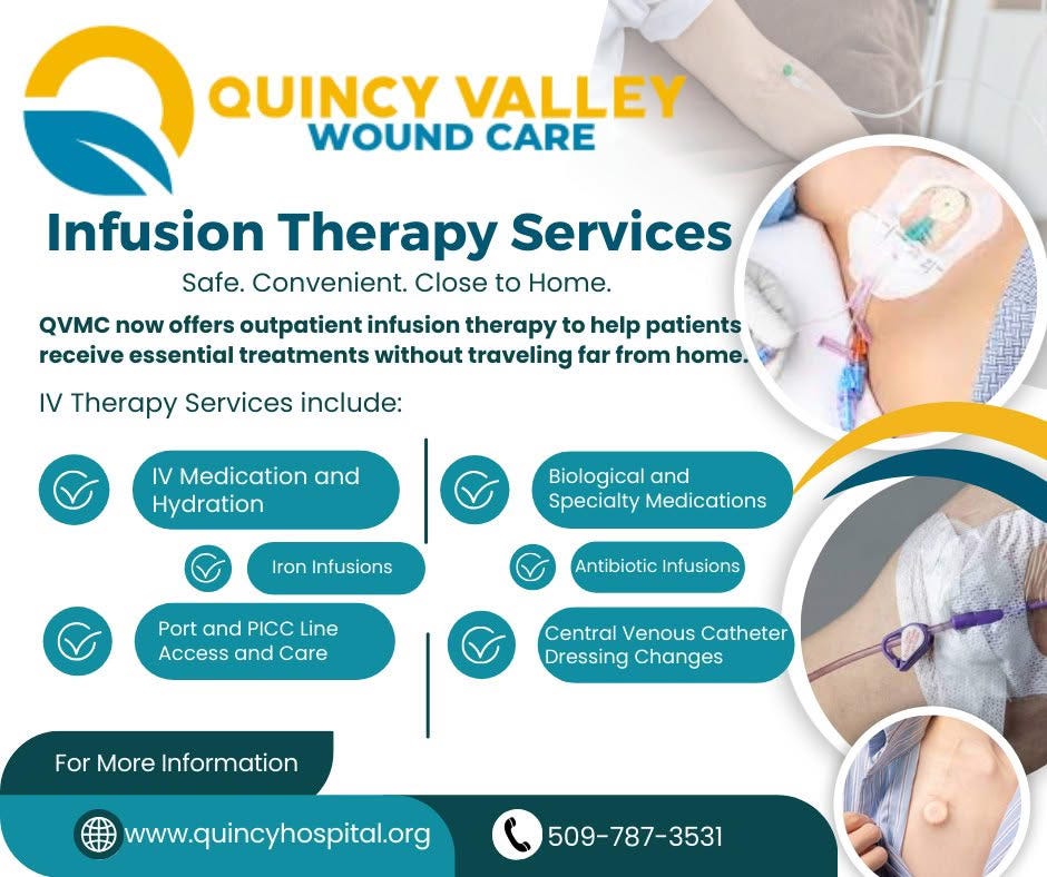 • Quincy Valley Medical Center currently offers iron infusions, hydration, antibiotics, biologics, and some port access services