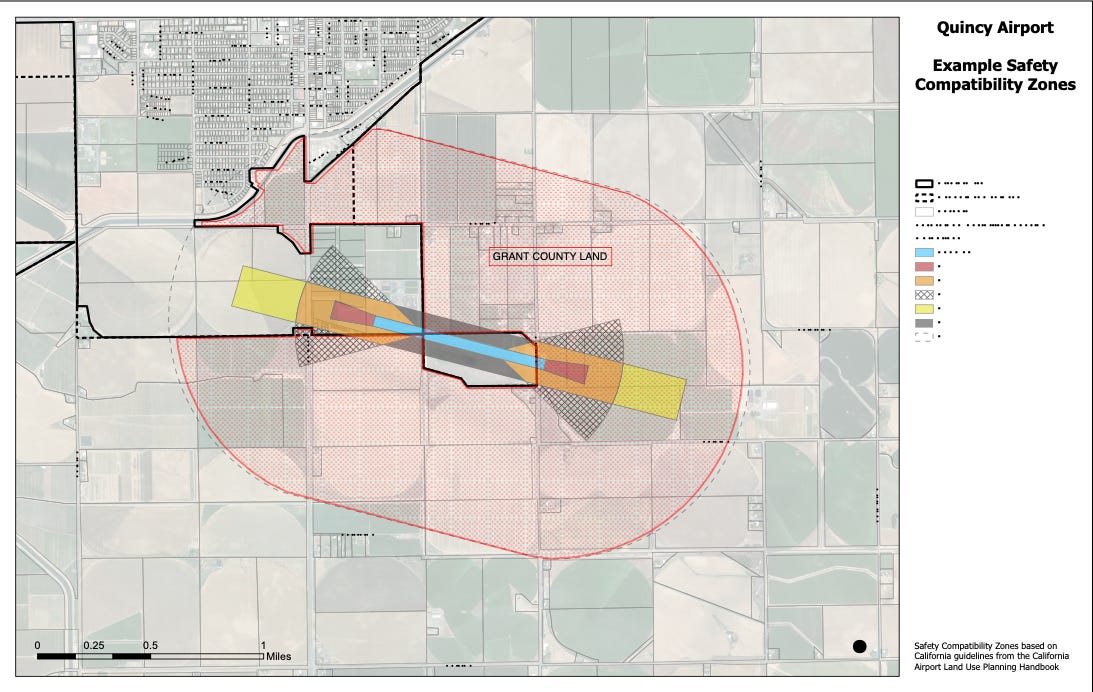 The city’s staff report laid out the basic problem clearly. Quincy currently has no airport zoning on the books, and because of that, any development near the airport would be subject to the underlying zoning plus WSDOT aviation standards. According to the city, a previous project review near the airport helped show that those default standards were overly restrictive for Quincy’s situation. That is what pushed the city toward writing its own local airport overlay code.